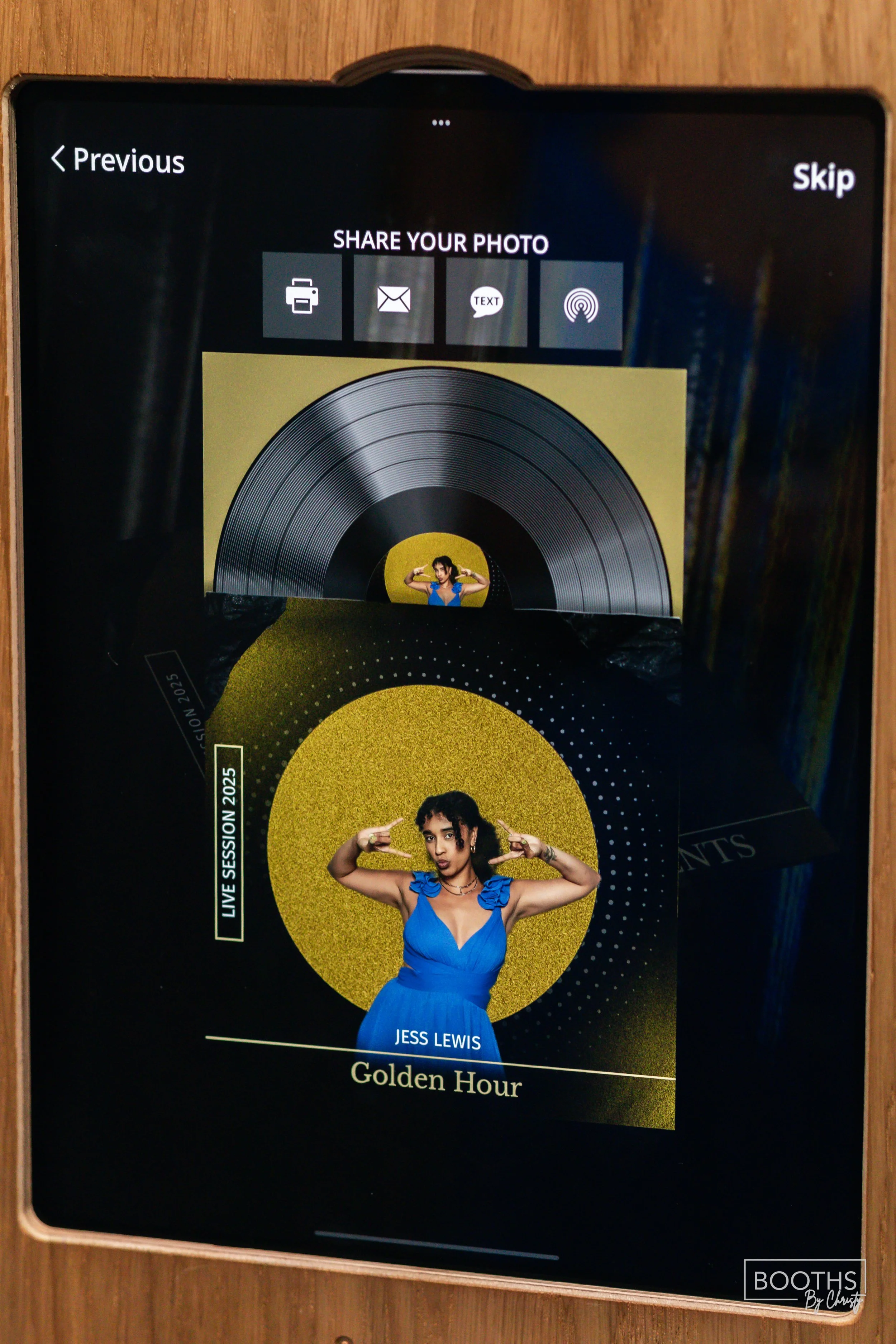 A modern photo booth activation that turns every session into a personalized record cover — complete with: