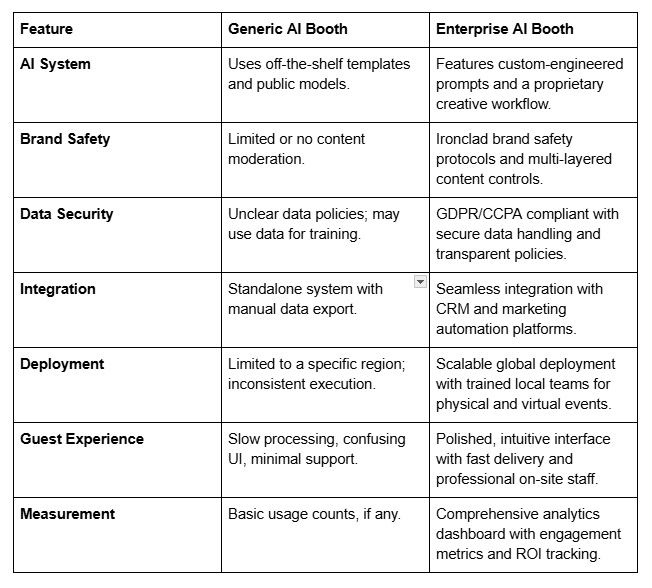 Choosing the wrong partner for your trade show, brand activation, or internal event doesn’t just lead to a lackluster experience. It can introduce significant risks, including brand damage from off-message creative, serious data security vulnerabilities, and a complete failure to deliver measurable business outcomes. The new standard for corporate events isn’t just about having AI; it’s about deploying Enterprise AI—a system engineered from the ground up for the security, scalability, and strategic demands of your business.